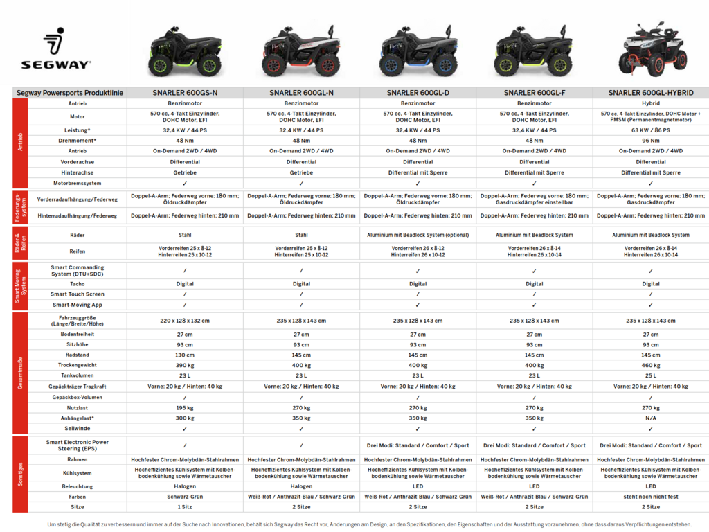 Die ATVs Segway Snarler von Segway Powersports umfassen eine überschaubare Anzahl von Fahrzeugen, zu denen z.B. die Segway Snarler 600 GL-F gehört.